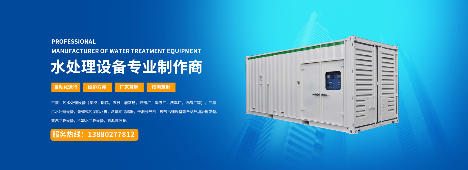 四川宇藍(lán)環(huán)保工程有限公司是水處理設(shè)備及各類環(huán)境治理設(shè)備的生產(chǎn)廠家并承接各類環(huán)境治理設(shè)備的工程項(xiàng)目。 公司專門從事各類環(huán)境治理設(shè)備及冷凝水蒸汽回收設(shè)備的開發(fā)、設(shè)計(jì)、制造、銷售以及技術(shù)服務(wù)的綜合性公司,主要產(chǎn)品有:污水處理設(shè)備(學(xué)校,農(nóng)村,屠宰場(chǎng),養(yǎng)殖場(chǎng),醫(yī)院,小區(qū),紙箱廠,洗滌廠等),油墨污水處理設(shè)備,疊螺式污泥脫水機(jī),斜塞式過濾器,干濕分離機(jī),廢氣治理設(shè)備等各類環(huán)境治理設(shè)備以及蒸汽回收設(shè)備,冷凝水回收設(shè)備,高溫高壓泵等各類節(jié)能減排的節(jié)能設(shè)備。 ...
